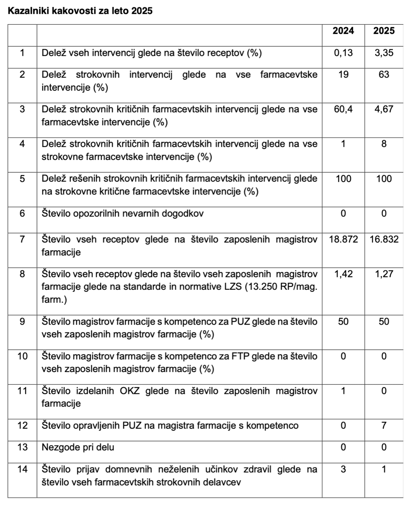 Kazalniki kakovosti so na voljo pristojnim organom v lekarni.